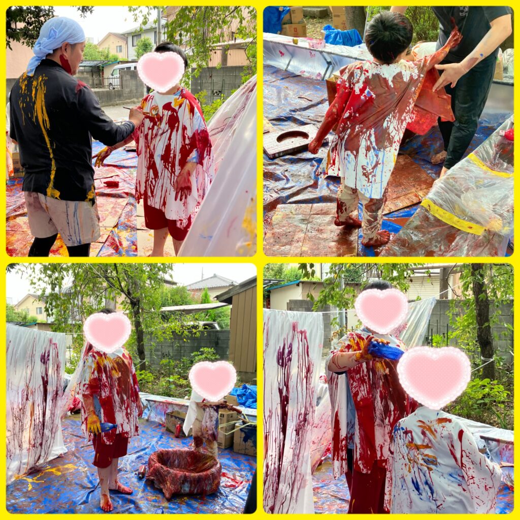 今年も香取神社の一角をお借りして絵の具イベントを開催しました!ビニールに絵を描いたり、先生たちも絵の具まみれで盛大に遊びました!
