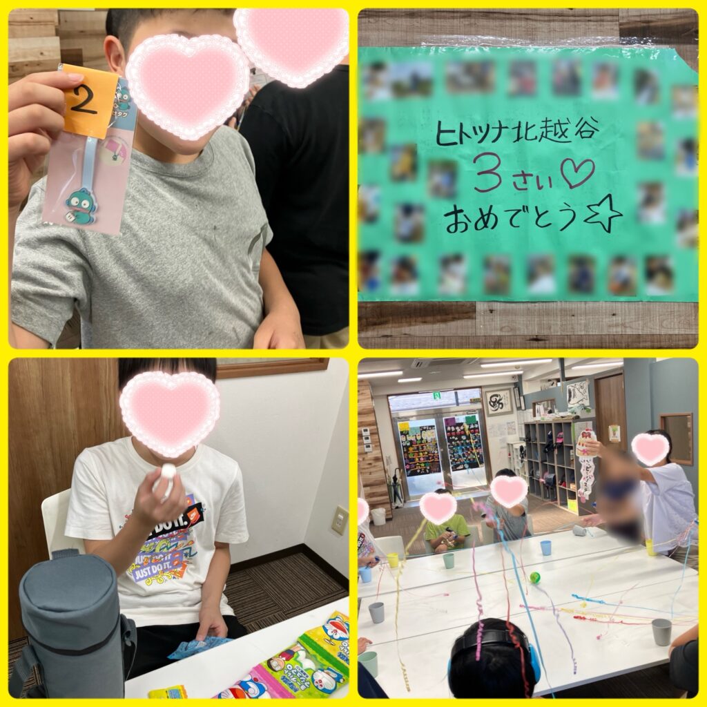 北越谷3周年パーティをしました!ジュースで乾杯してお菓子を食べ、ビンゴゲームなどを楽しみました!