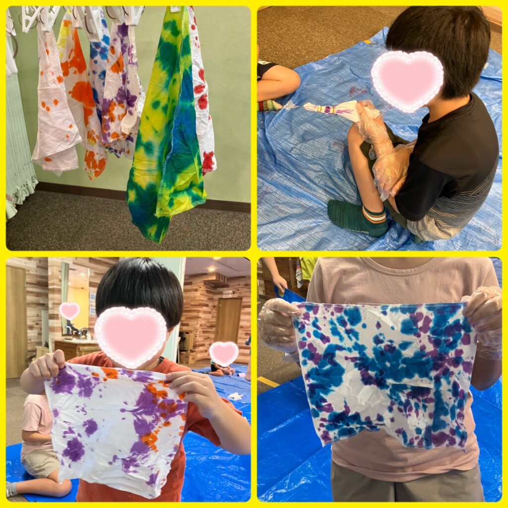武里教室にお邪魔して一緒にタイダイ染めをしました!滅多にない武里教室訪問でウキウキの子供達!タイダイ染めの後はプラレールや工作などで交流を深めました!