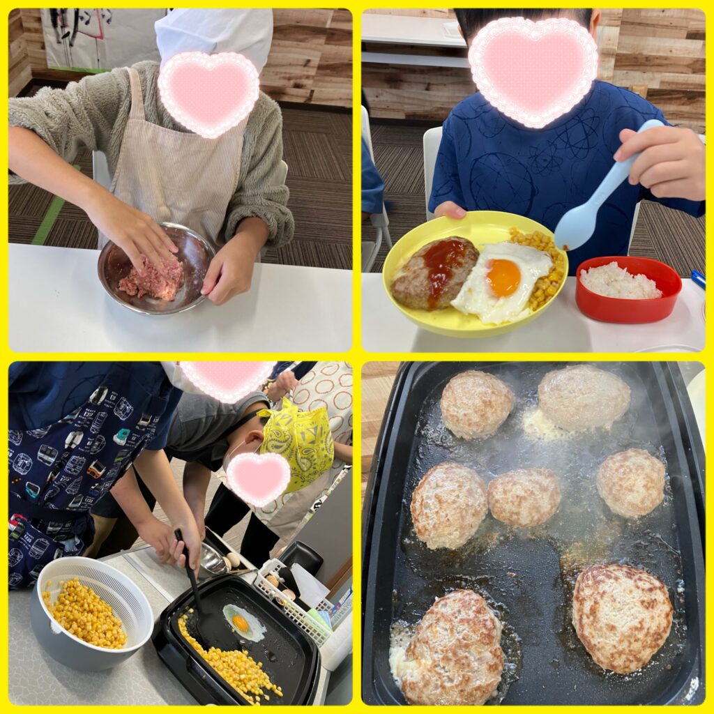 LABO会議で出た「ハンバーグ作り」を叶えました!玉ねぎのみじん切り、目玉焼き担当、挽き肉グラム分けなど役割分担して材料を準備し、自分でハンバーグを捏ねました!